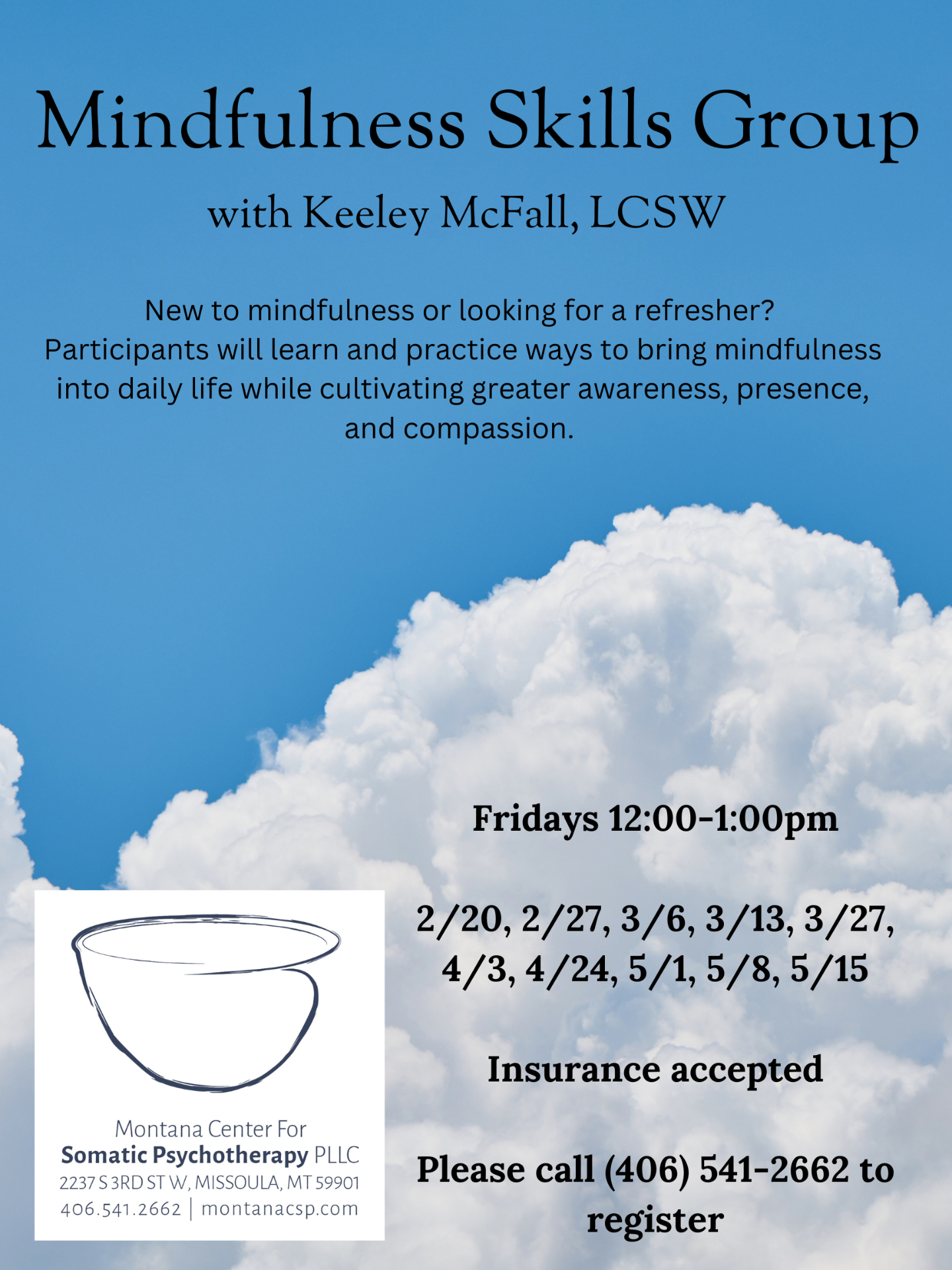 This group will be practice-focused and folks will be encouraged to explore different techniques to their own comfort level. We’ll explore strategies for integrating mindfulness into daily activities and we will engage in more structured/formal mindfulness techniques, such as breath awareness, body scanning, and mindful meditation. Throughout the group, we will focus on bringing a gentle, compassionate awareness to all experiences.